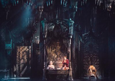 The spectacular sets and costumes attracted the unanimous attention of the audience. The set designer Kentaur’s work resembled the pages of a fairytale book, leafing through which, the audience admired the throne room, a huge talking mirror, the edge of the forest with fluttering butterflies, a diamond mine glowing with different lights, and a two-floor cozy dwarf home. The set design was so mesmerizing that the audience did not hide their delight.